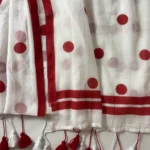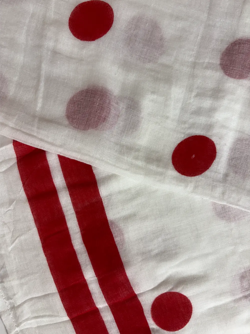 Soft as a sigh and cheerful as a bloom, Cherry Mist is a drape that makes hearts skip a beat. The pure white mul cotton is adorned with playful red polka dots, while the vibrant red border adds a striking edge. Finished with red-and-white tassels that sway like little bursts of joy, this saree is a perfect mix of comfort, charm, and effortless beauty.