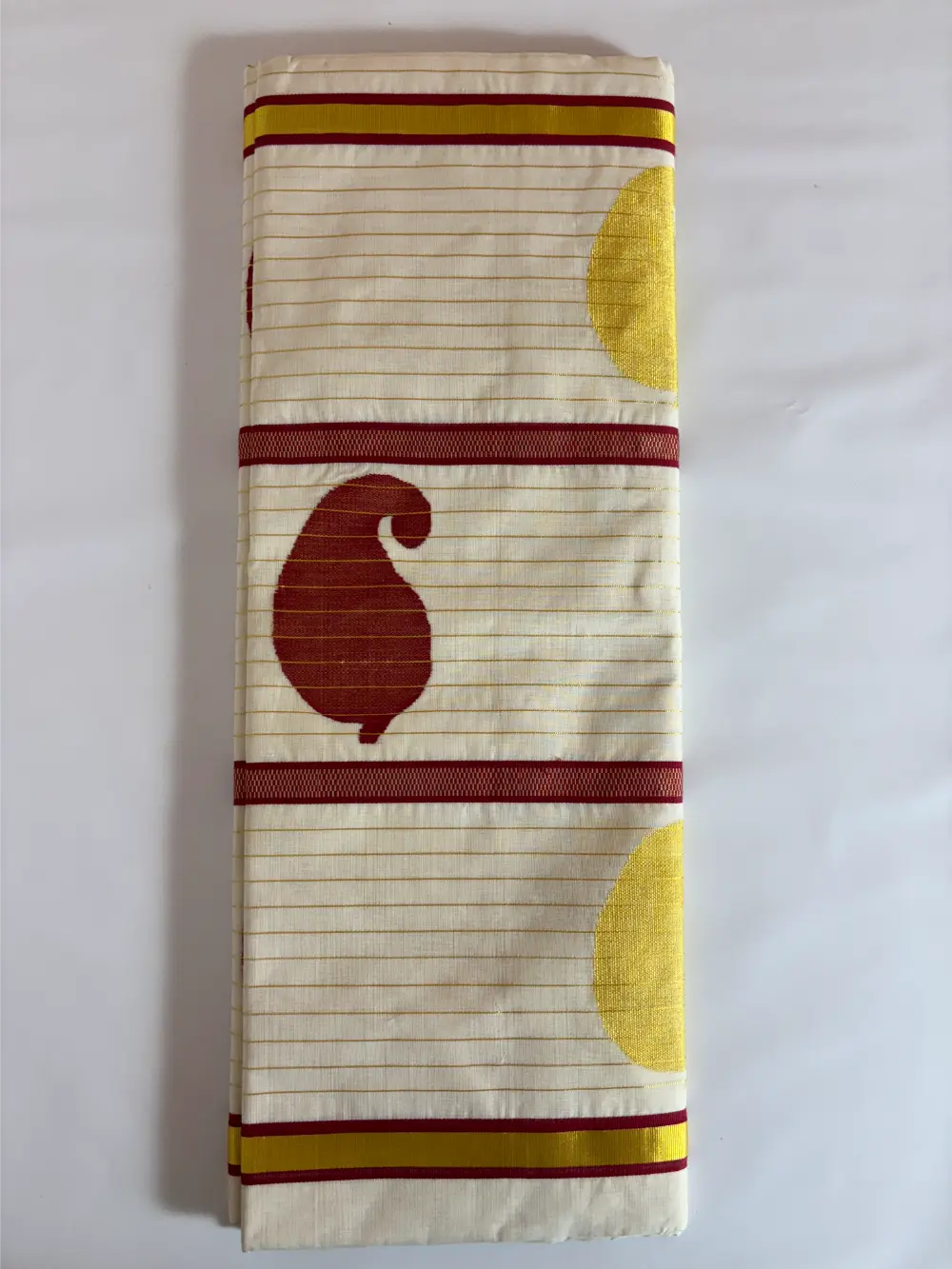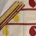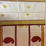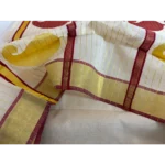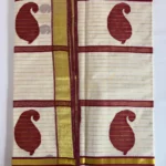 A regal symphony in pure zari, Golden Ambrosia celebrates Kerala’s weaving heritage with unmatched grandeur. The saree’s lustrous body is adorned with delicate golden mango motifs — each a timeless emblem of prosperity — while the pallu blooms in rich maroon artistry, alive with larger mango patterns and intricate detailing. Maroon kara borders frame the drape with warmth, while a fine line of golden kara runs throughout, catching the light with every movement. This is not just a saree — it’s the crown jewel of tradition, meant for moments that deserve to be remembered forever.