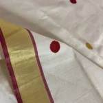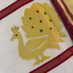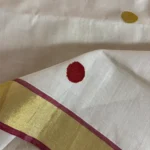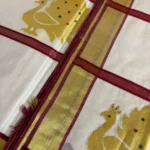 Every thread of Mayurangana whispers of grandeur. This pure zari masterpiece is a vision in regal maroon, with the pallu resplendent in intricate peacock motifs, their feathers unfurling in hues of deep green and gold. The maroon kara frames the saree with stately elegance, while delicate golden kara stripes and tiny polka dots dance across the body, adding playful charm to its royal grace. Woven with precision by master artisans, this saree isn’t just a drape—it’s a legacy, a showstopper meant for moments you’ll never forget.