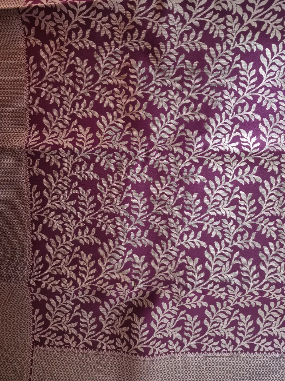 Soft, serene, and spellbinding — Plum Ivy drapes in shades of royal violet, adorned with graceful silver leaf motifs. Crafted in luxurious brocade silk, its delicate jacquard border glimmers with quiet sophistication. Each thread tells a story of craftsmanship and calm elegance — a saree that feels like poetry in motion.