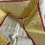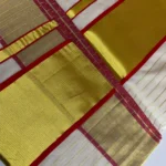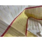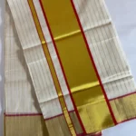 A timeless Kerala kasavu saree, handwoven in fine cotton with radiant golden stripes flowing through the body. The lustrous kasavu border is elevated by a bold red kara, adding a pop of traditional charm. Graceful, versatile, and steeped in heritage, this piece is perfect for festive mornings, cultural gatherings, and treasured moments.