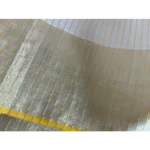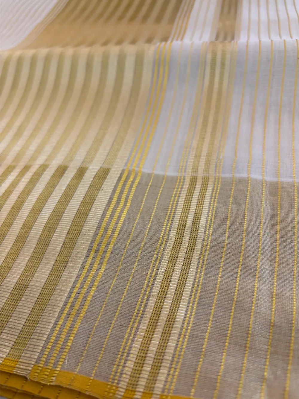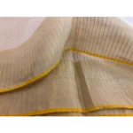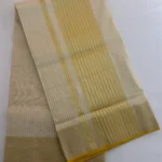 A Kerala saree reborn — this masterpiece blends tradition with innovation. While kasavu threads are usually crafted in either gold or silver, here both shimmer together in perfect harmony, creating a luminous dual-toned beauty. Stripes run gracefully across the body, giving depth and texture, while the innovative loom work reimagines a timeless classic for the modern connoisseur.
